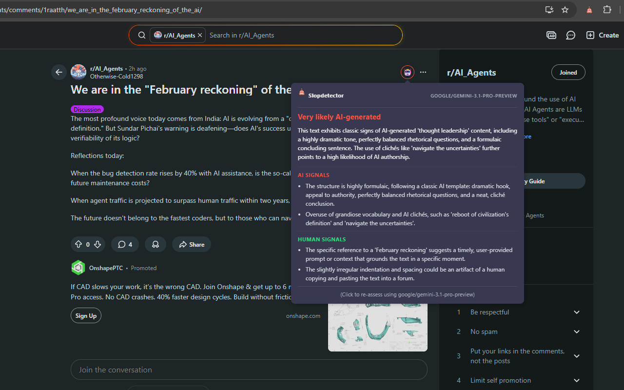 Example: A Reddit post flagged for being AI generated with detailed reasoning.
