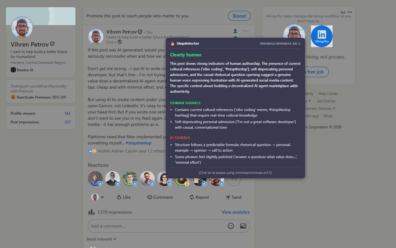 SoMe AI-slop detector for Chrome - Slopdetector